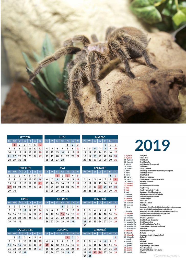 Dla wszystkich tych którzy lubią do czasu do czasu popatrzeć na jakiegoś ośmionożnego. To już druga edycja kalendarza ptaszniki zająca którą przygotowałem sukces pierwszego uświadomił mi że tegoroczny musi być jeszcze lepszy dodałem miejsca występowania pająków ze zdjęć a tło osnute jest pajęczyną. Dodaj do koszyka.