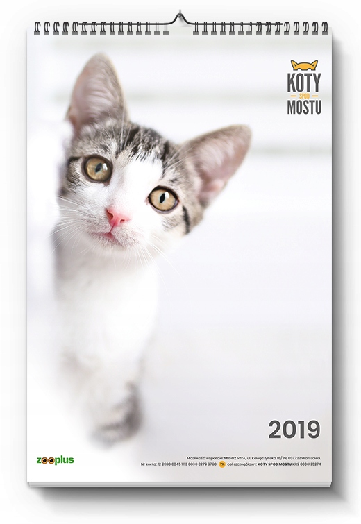 - Kalendarz charytatywny na rok 2019 koty spod mostu w formacie a3 to wspaniała okazja by dołożyć swoją cegiełkę do wyjątkowego dzieła kupując go wspierasz organizację koty spod mostu która powstała w jednym celu by uratować jak największą liczbę porzuconych bezdomnych kotów i znaleźć im nowe ciepłe i co przecież najważniejsze kochające domy.